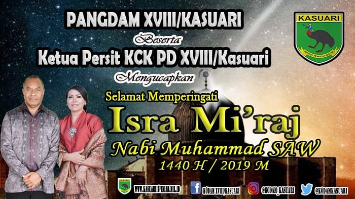 PANGDAM XVIII/KASUARI BESERTA KETUA PERSIT KCK PD XVIII/KASUARI MENGUCAPKAN SELAMAT MEMPERINGATI ISRA MI’RAJ NABI MUHAMMAD SAW 1440H / 2019 M