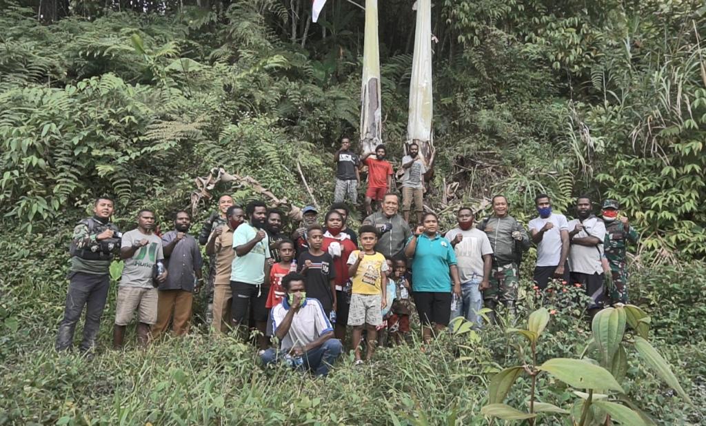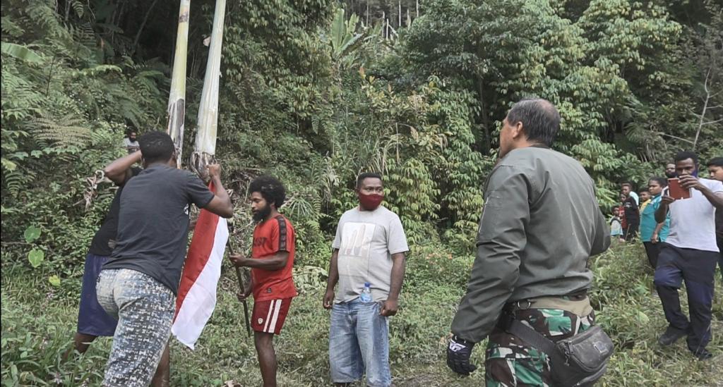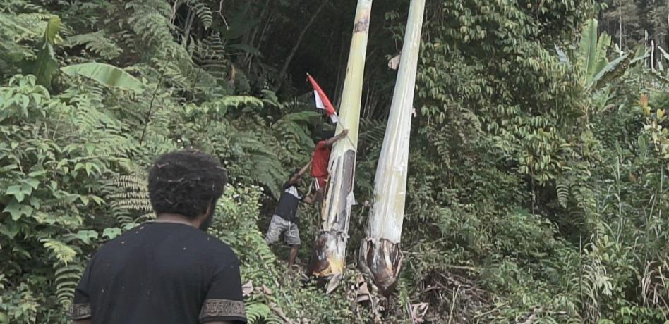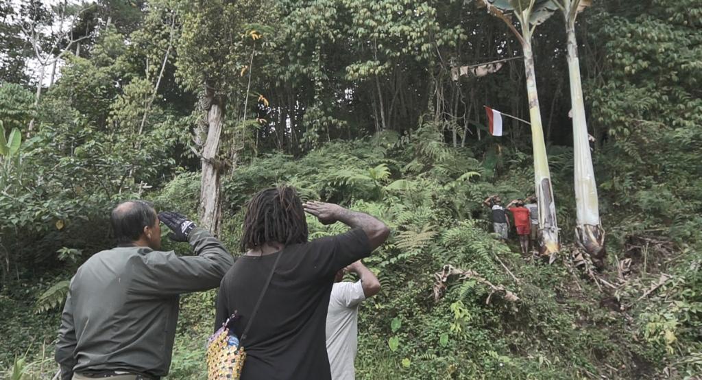 Setelah bendera diberikan, masyarakat tersebut langsung mengibarkannya di salah satu pohon pisang raksasa di pinggir hutan yang berada dekat dengan mereka dengan memanjat pohon tersebut.