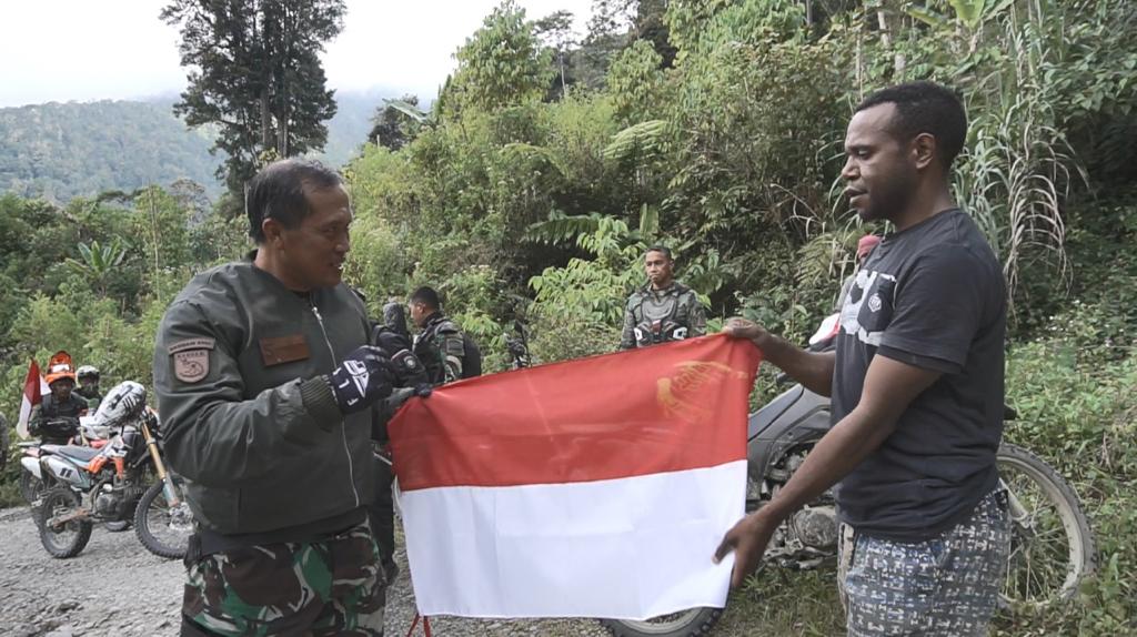 “Bapak ini ada bendera, nanti di pasang, kita punya tanah ini harus di jaga, kita punya orang tua, leluhur, pejuang, pahlawan dari tanah Papua ini banyak, ada Marthen Indey, Frans Kaisiepo, Abraham Johanes Dimara dan lain sebagainya,” ujar Pangdam.