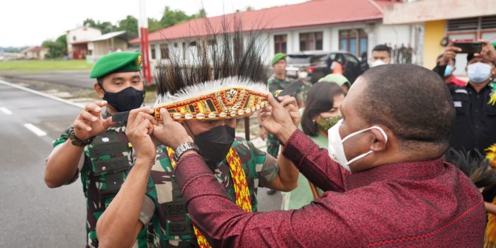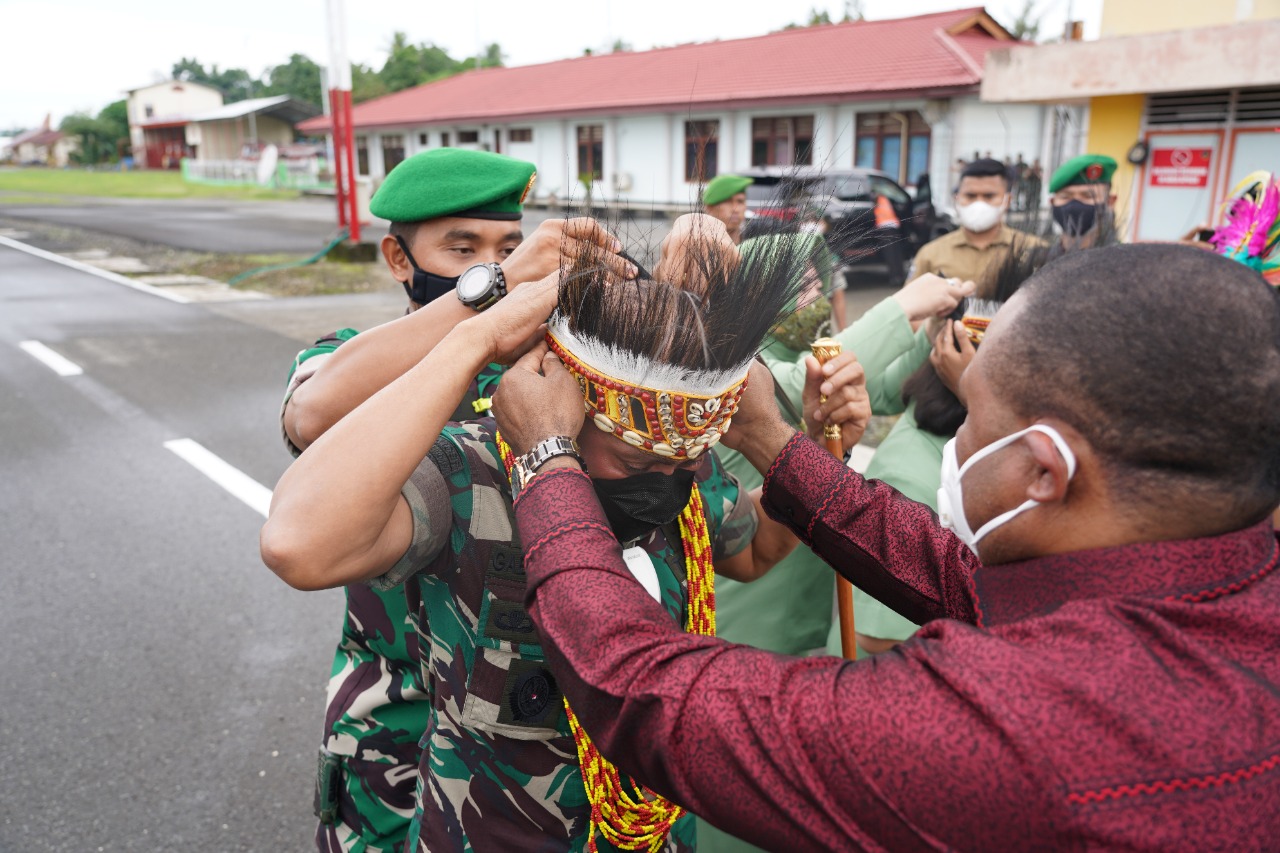 Manokwari. kodam18kasuari.tni-ad.mil.id – Kedatangan Pangdam XVIII Kasuari, Mayjend TNI Gabriel Lema, S.Sos., bersama Ketua Persit Kartika Chandra Kirana (KCK) Daerah XVIII/Kasuari, Ny. Alin Gabriel Lema disambut dengan tarian adat, pengalungan bunga, pemasangan topi adat dan prosesi injak piring sebagai tanda ucapan selamat datang di Manokwari.