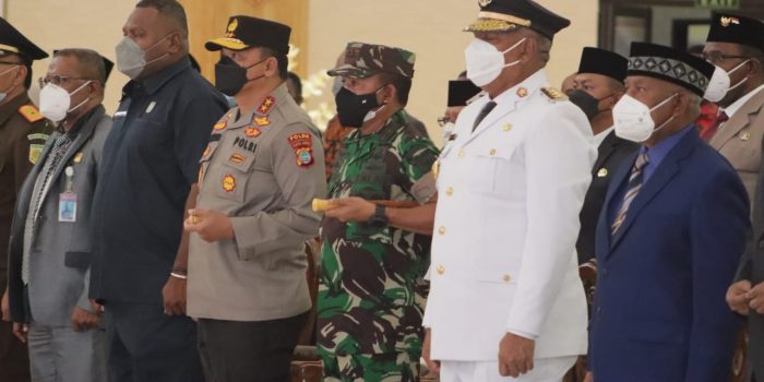 Manokwari. kodam18kasuari.tni-ad.mil.id – Pangdam XVIII/Kasuari, Mayjen TNI Gabriel Lema, S.Sos., didampingi Ketua Persit KCK Daerah XVIII/Kasuari, Ny. Alin Gabriel Lema menghadiri acara yang digelar oleh Pemerintah Provinsi Papua Barat dalam rangka serah terima jabatan (Sertijab) mantan Gubernur dan Wakil Gubernur periode 2017 sampai dengan 2022 yaitu Drs. Dominggus Mandacan,M.Si dan Mohammad Lakotani,S.H.,M.Si., kepada Penjabat Gubernur Komjen Pol (Purn) Drs. Paulus Waterpauw, M.Si., di Gedung Auditorium PKK Provinsi Papua Barat, Manokwari, Jumat (20/5/2022).