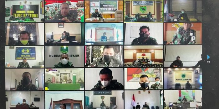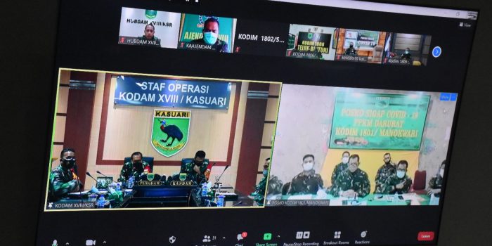 Pangdam XVIII/Kasuari selaku Panglima Komando Tugas Gabungan Terpadu (Pangkogasgabpad) Mayjen TNI I Nyoman Cantiasa, S.E., M.Tr.(Han)., bersama jajarannya melakukan evaluasi penanganan Covid-19 yang sudah dilaksanakan melalui rapat secara virtual dari ruang rapat Sopsdam XVIII/Kasuari, Makodam, Trikora, Arfai 1, Manokwari, Papua Barat, Jumat (16/7/2021).