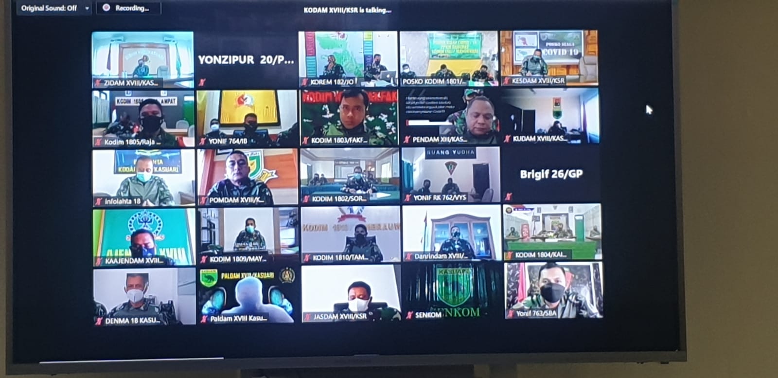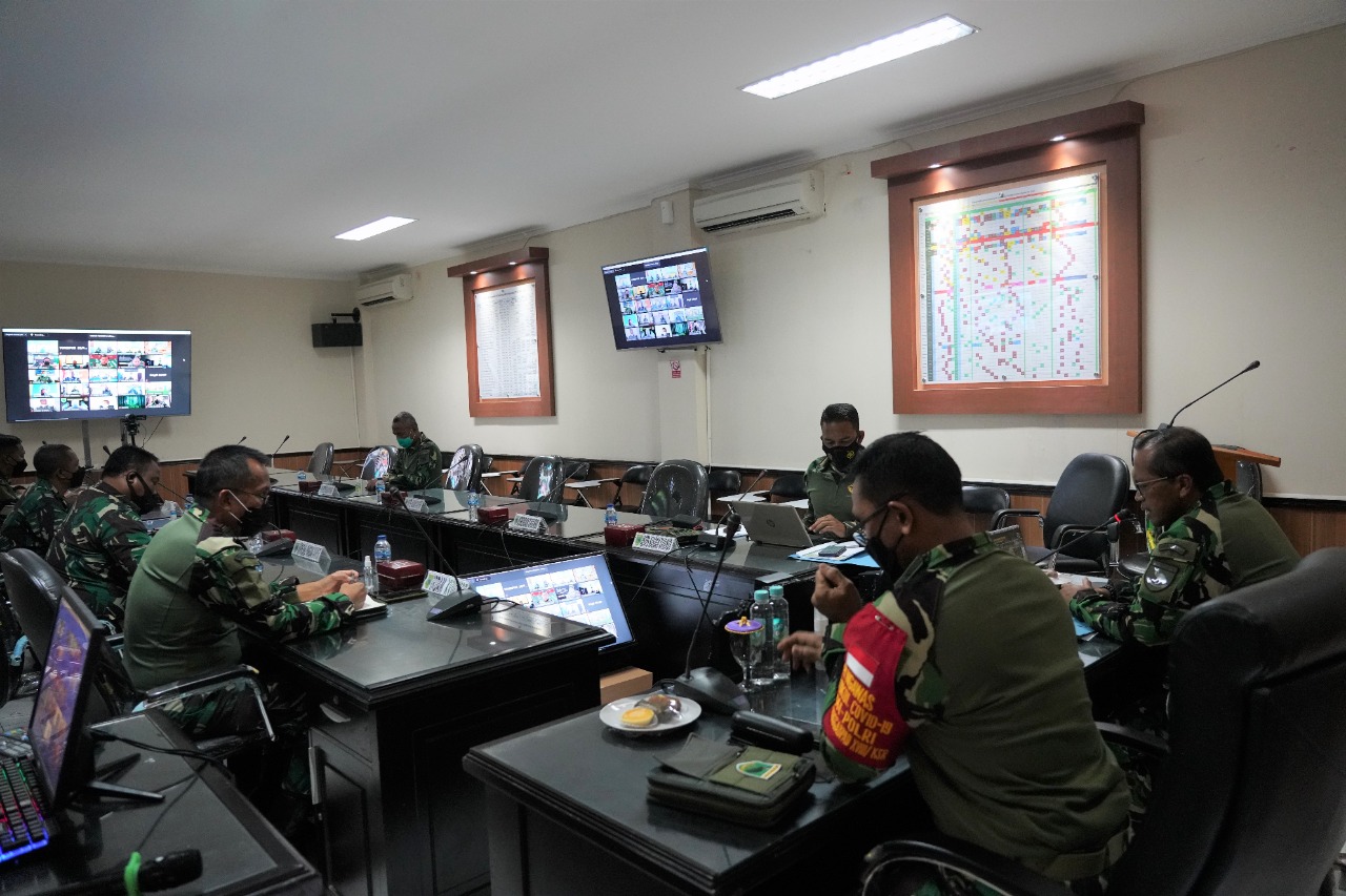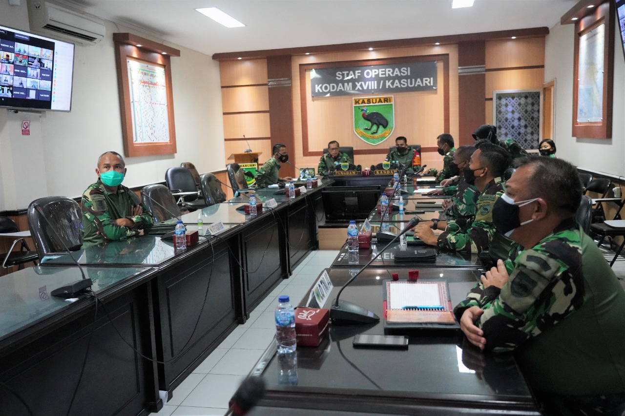 Manokwari. kodam18kasuari.tni-ad.mil.id –Pangdam XVIII/Kasuari selaku Panglima Komando Tugas gabungan Terpadu (Pangkogasgabpad) Mayjen TNI I Nyoman Cantiasa, S.E., M.Tr.(Han)., bersama jajarannya terus melakukan evaluasi penanganan Covid-19 di wilayah Papua Barat melalui rapat secara virtual dari ruang rapat Sopsdam XVIII/Kasuari, Makodam, Trikora, Arfai 1, Manokwari, Papua Barat, Rabu (21/7/2021).