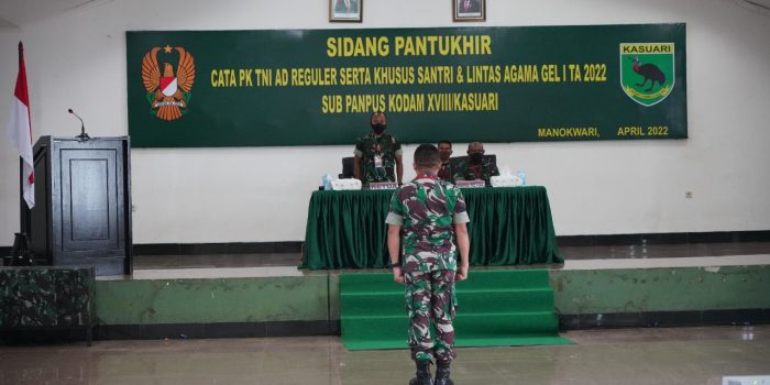Manokwari. kodam18kasuari.tni-ad.mil.id – Pangdam XVIII/Kasuari, Mayjen TNI Gabriel Lema, S.Sos., memimpin langsung sidang Pantukhir Cata PK Reguler serta Khusus Santri dan Lintas Agama Gelombang I TA. 2022 Sub Panpus Kodam XVIII/Kasuari, di aula Makodam, Trikora, Arfai 1, Manokwari, Papua Barat, Selasa (26/4/2022).