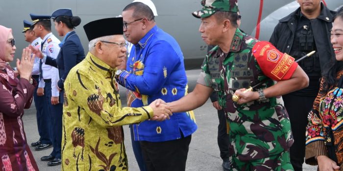Sorong- Papua Barat Daya, Pangdam XVIII/Kasuari Mayjen TNI Hariyanto, S.I.P., M.Tr. (Han) didampingi Ny. Rina Haryanto menyambut kedatangan Wakil Presiden RI Prof. Dr. (H.C) K.H. Ma’ruf Amin beserta Ibu HJ. Wury Ma’ruf Amin dan Rombongan di Bandara Bandara DEO, Minggu (5/6/2024).