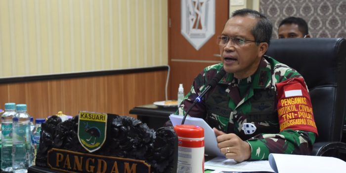 Manokwari. kodam18kasuari.tni-ad.mil.id – Pangdam XVIII/Kasuari, Mayjen TNI I Nyoman Cantiasa, S.E., M.Tr.(Han) secara virtual membuka pembekalan kepada 120 personel Satuan Bawah Kendali Operasi (BKO) Kodim Persiapan gelombang III yang berada di wilayah Sorong, Papua Barat, di ruang Puskodalopsam XVIII/Kasuari, Rabu (7/7/2021).