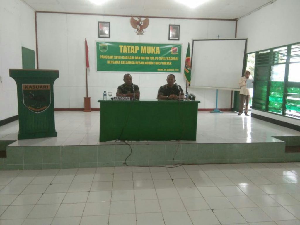 Fakfak – Pangdam XVIII/Kasuari Mayjen TNI Joppye Onesimus Wayangkau yang di dampingi Ibu Ketua Persit PD XVIII/Kasuari Ny. Istriani N Hidayati beserta Aslog XVIII/Kasuari Kolonel Kav Aloysius Nugroho Santoso dan Kazidam XVIII/Kasuari Kolonel Czi I Made Sutia melaksanakan Tatap muka Bersama Prajurit Kodim 1803/Fakfak dan Persit KCK Cabang XIV Fakfak Bertempat di Aula Makodim 1803/Fakfak, Jumat (09/08/2019).