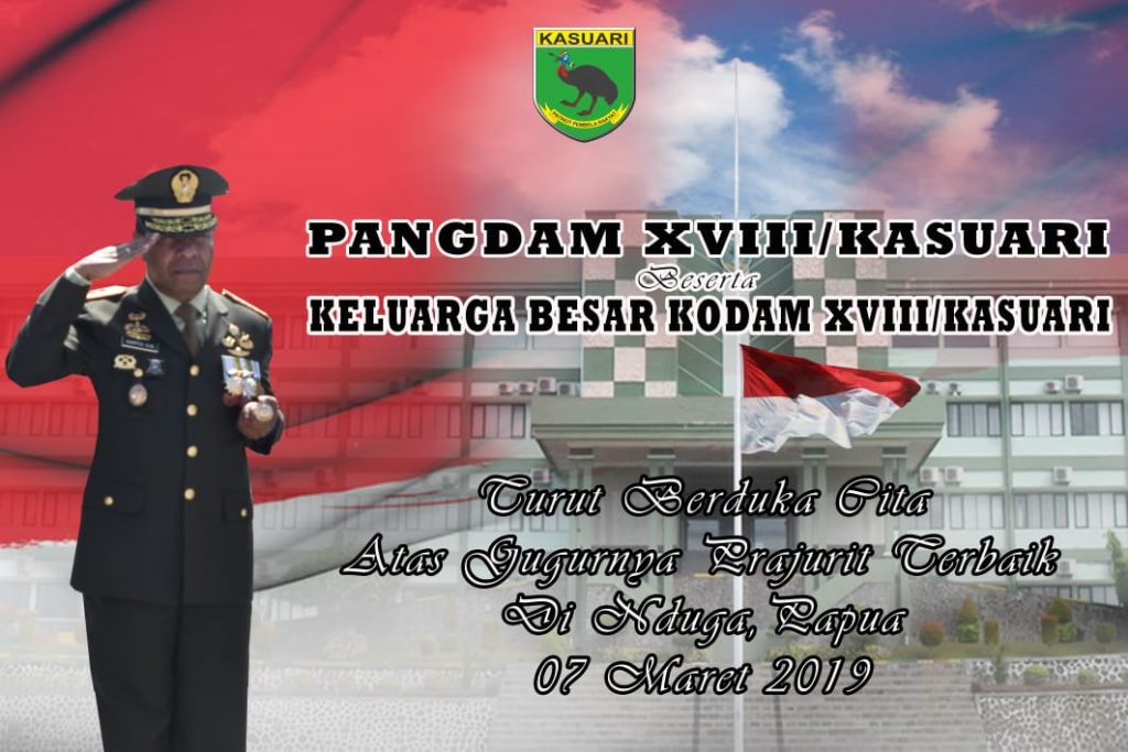Pangdam XVIII/Kasuari Beserta Keluarga Besar Kodam XVIII/Kasuari “Turut Berduka Cita Atas Gugurnya Prajurit Terbaik Di Nduga Papua 07 Maret 2019” admin 08/03/2019 BERITA KEGIATAN Posted in BERITA KEGIATAN, PENGUMUMAN Navigasi pos Previous Previous post: Turut Berduka Cita Atas Gugurnya Para Kusuma BangsaNext Next post: Pangdam XVIII/Kasuari Mengucapkan Dirgahayu Ke 43 Infolahta AD “Dengan dilandasi Semangat Widyuta Awasara Anindaya Guna Kita Tingkatkan Profesionalisme Prajurit Di Bidang Teknologi Informasi Untuk Mendukung Tugas Pokok TNIAD”