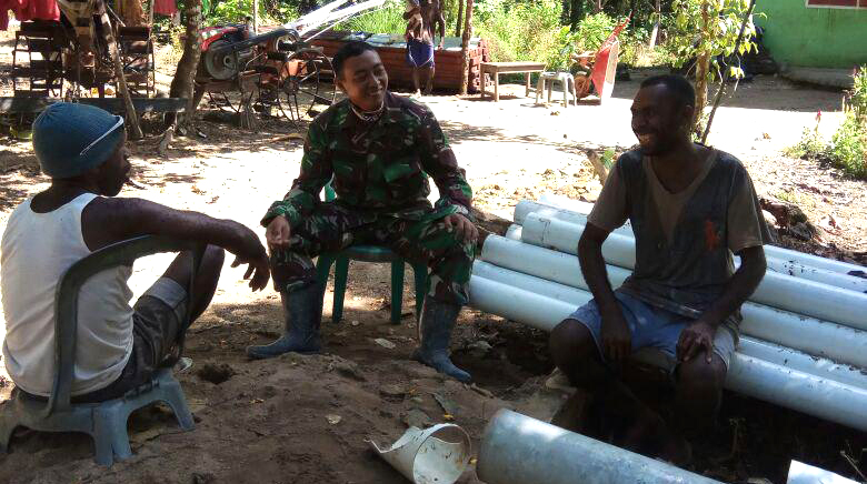 Makbon – Babinsa Kampung Batu Lubang Koramil 1704-10/Makbon Serda Abdul Majid melaksanakan Komunikasi Sosial dengan Para Petani yang akan rencana memasang pipa irigasi ke sawah miliknya, bertempat di Kampung Batu, Distrik Makbon, Kab Sorong, Minggu (03/09/2017).