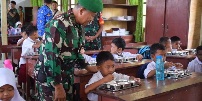 Sorong. Papua Barat Daya – Komandan Kodim 1802/Sorong Letkol Czi Angga Wijaya S.IP,. MA diwakili Pasiter Kodim 1802/sorong Lettu Inf suyatno menghadiri Kegiatan Launching makan bergizi gratis untuk siswa SD Inpres 18 Kabupaten Sorong. Bertempat jalan tuturuga distrik mariat kabupaten sorong. Senin (17/02/2025).