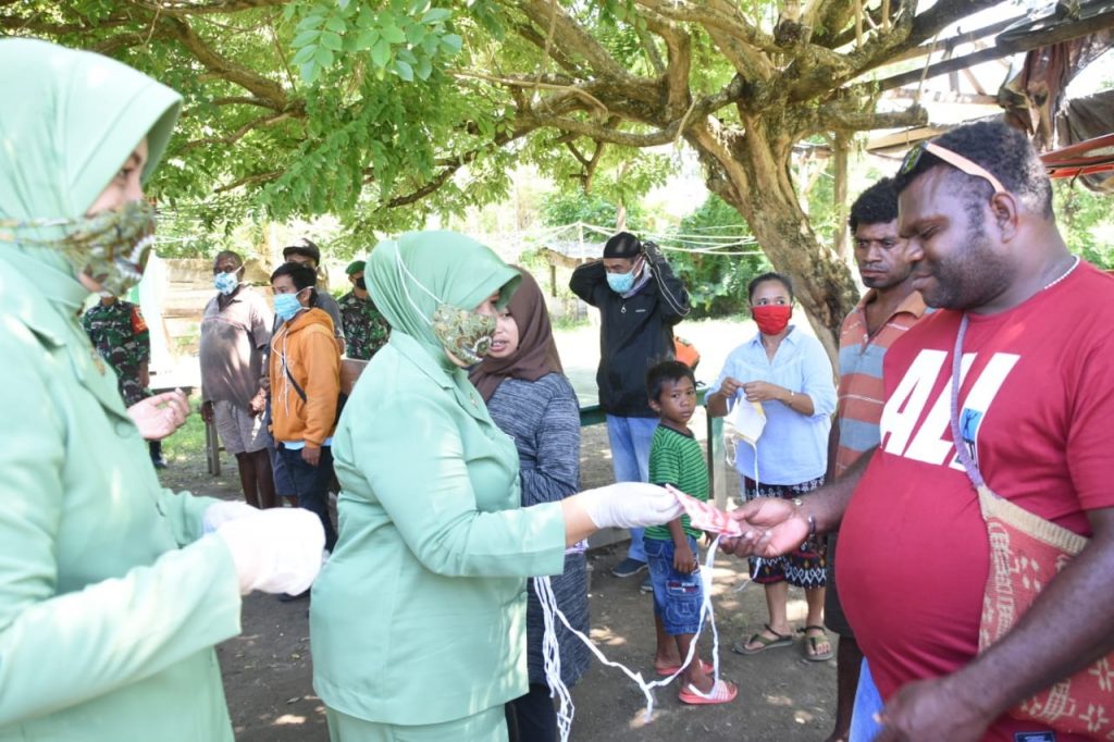 Pembagian masker batik bantuan dari Yayasan Batik Indonesia kepada masyarakat Indonesia dalam rangka mencegah penyebaran Covid-19 melalui Dharma Pertiwi Peduli Daerah P tersebut digelar saat Ketua Dharma Pertiwi Daerah P yang didampingi pengurus Dharma Pertiwi Daerah P melakukan kunjungan kerja kedua di Koramil jajaran Kodim 1802/Manokwari, Kodam XVIII/Kasuari.