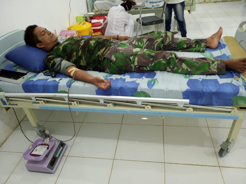 Raja Ampat – Babinsa Koramil 1805-01/Waisai, Kodim 1805/Raja Ampat Serda Buce Tomasoa membantu warga yang membutuhkan darah bertempat di RSUD Kab. Raja Ampat, Jumat (10/05/2019).