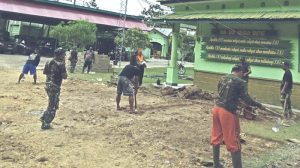 Dalam kegiatan yang dipimpin langsung dandim 1713/kaimana Letkol inf Sabdono budi Wiryanto S.E anggota kodim dan jajaran bekerjasama dalam perbaikan lapangan apel.