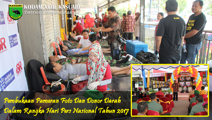 Sorong – Danrem 171/PVT Kolonel Inf Ignatius Yogo Triyono, MA, yang di Wakili oleh Pasiter Korem 171/PVT Mayor Kav Abdul Mufid menghadiri Acara Pembukaan Pameran Foto dan Donor Darah Dalam Rangka Hari Pers Nasional Tahun 2017, turut hadiri oleh Kepala Kementrian Pemuda dan Olahraga Kota sorong Fanix Tehupeuri, Dandenma Yonmarhanlan Sorong Mayor Mar Suroso, Kepala RRI Sorong Joko Purnomo, Ketua PWI Sorong Ruben Isir S.Sos, bertempat di Ramayana Mall, Klademak, Sorong-Papua Barat, Kamis (9/2).