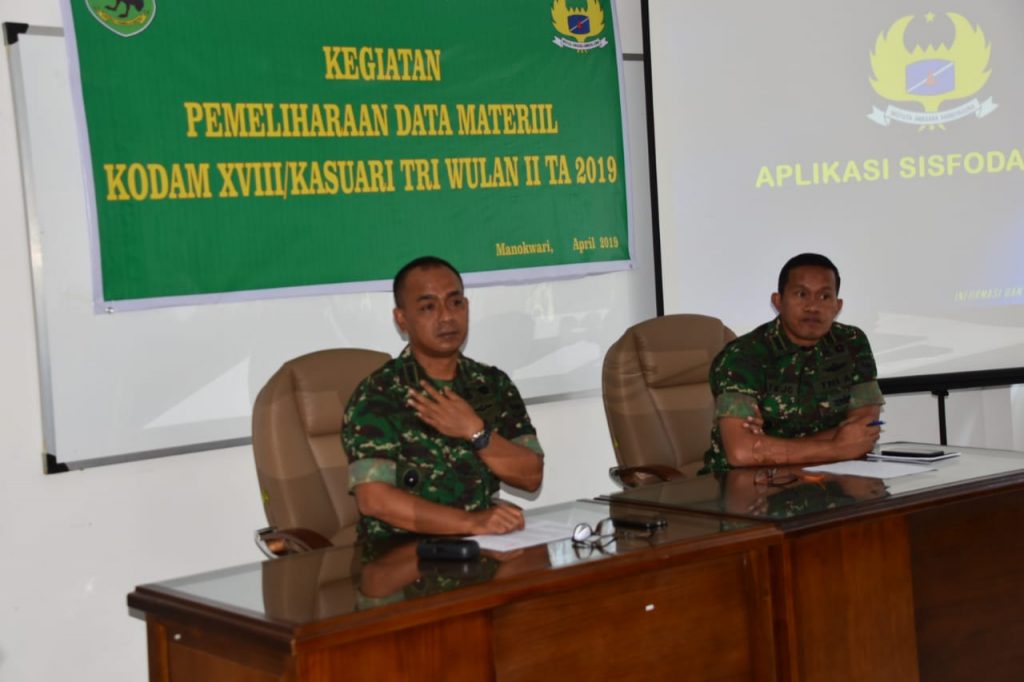 Manokwari – Bertempat di aula kantor Infolahtadam XVIII/Ksr, para operator Sisfodatalog dari tiap Badan Pelaksana dan Pelayan Kodam XVIII/Ksr mengikuti Sosialisasi Asistensi Aplikasi Sisfodatalog TNI AD dan Input Datalog yang dibuka oleh Aslog Kasdam XVIII/Ksr Kolonel Kav Aloysius dan didampingi Kainfolahtadam XVIII/Ksr Kolonel Arm Tejo Widuro S.Sos ,M.Si Selasa 23 April 2019 pukul 10.00 WIT.