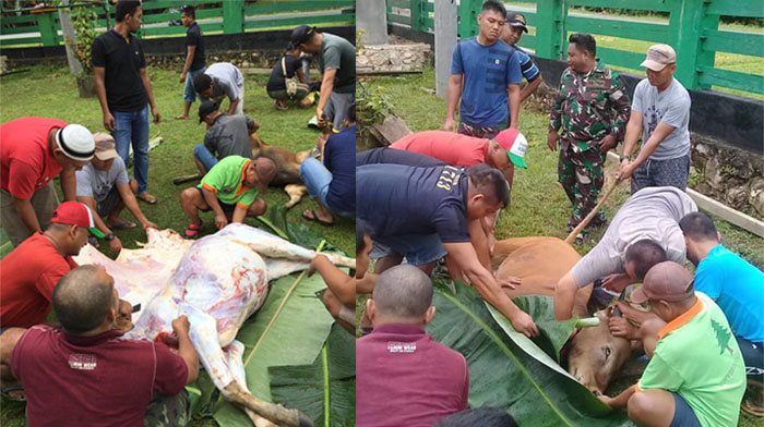 Kegiatan dilanjutkan dengan pemotongan hewan kurban dan setelah dilaksanakan pemotongan akan dibagikan kepada seluruh Jamaah Masjid Al-Ikhlas Kodim 1713/Kaimana dan masyarakat sekitar yang berhak menerimanya.
