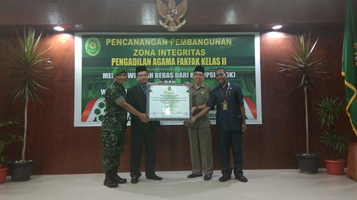 Fakfak – bertempat di Aula Sidang Pengadilan Agama Fakfak telah diadakan pencanagan pembangunn Zona integritas Pengadilan Agama Fakfak kelas II menuju wilayah Bebas Dari Korupsi ( WBK ) dan Wilayah Birokrasi Bersih Melayani ( WBBM ) yang dihadiri sekitar -+ 20 orang, Turut hadir dalam acara tersebut yaitu, Drs. Nsarun P Elake ( Sekda Kab. Fakfak ), Letkol Inf. Yatiman, A. Md ( Dandim 1803/Fakfak ), Akbp Deddy Fouri Millewa, S.H S. IK M. IK  (Kapolres Fakfak ), Ketua pengadilan negeri Fakfak, Drs. H. Jumroni mewakili ketua kantor agama, Direktur Bank Mandiri Fakfak, Leo Fajar K  ( Bank BRI), Selasa (22/1/2019).
