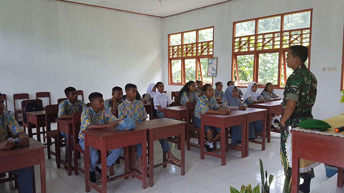 Saonek – Babinsa Koramil 1704-03/Saonek Sertu Ari Komang, memberikan materi wawasan kebangsaan kepada 28 orang siswa-siswi SMA Negeri 1 Raja Ampat, Kab Raja Ampat, Papua Barat, Selasa (22/08/2017).