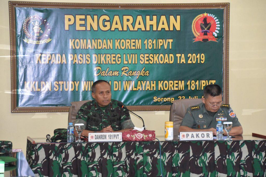 Dalam sambutan Danrem 171/PVT Brigjen TNI Ignatius Yogo Triyono, M.A mengatakan bahwa merupakan suatu kebanggaan sekaligus kehormatan, dalam hal ini Satuan Korem 181/PVT dijadikan sebagai salah satu objek kegiatan KKLDN Study Wilayah Pertahanan Pasis Dikreg LVII Seskoad tahun 2019, dimana Satuan Korem 181/PVT yang merupakan bagian dari Kodam XVIII/Kasuari berkedudukan di Sorong, dengan membawahi 5 Kodim dan 1 Batalyon Raider dengan Dislokasi sebagai berikut : Kodim 1801/Manokwari berada di Ibu Kota Provinsi Manokwari, Kodim 1802/Sorong berada di Kota Sorong, Kodim 1803/Fakfak berada di Kabupaten Fakfak, Kodim 1804/Kaimana berada di Kabupaten Kaimana, Kodim 1805/Raja Ampat berada di Waisai Raja Ampat dan Yonif Raider Khusus 762/VYS berada di Kota Sorong. Selain itu ada beberapa Satuan yang merupakan badan Pelaksana Korem yang membantu pelaksanaan tugas-tugas Korem 181/PVT dan semuanya berkedudukan di Kota Sorong.