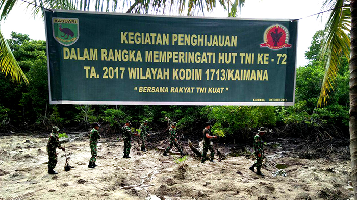 Kaimana – Pasiter Kodim 1713/Kaimana Kapten Inf Setiyono, bersama babinsa dan masyarakat melaksanakan penghijauan di sekitar Pantai Air Tiba Krooy Kaimana, guna menciptakan lingkungan yang hijau, Kamis (03/10/2017).