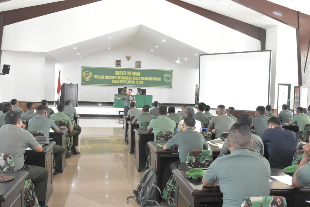 Manokwari – Kodam XVIII/Kasuari melaksanakan kegiatan Penilaian Mandiri Pelaksanaan Reformasi Birokrasi (PMPRB) di aula Makodam XVIII/Kasuari. Kegiatan tersebut dipimpin oleh Asisten Perencanaan Kodam XVIII/Kasuari (Kol Chb Jf Sianipar S.E.M) dengan pemberi materi oleh Tim dari Mabesad (Letkol Caj (K) Sumiarti dan Mayor Arh Ivan Juniar) dan diikuti oleh Prajurit dan PNS Kodam XVIII/Kasuari, Senin (30/10/18).