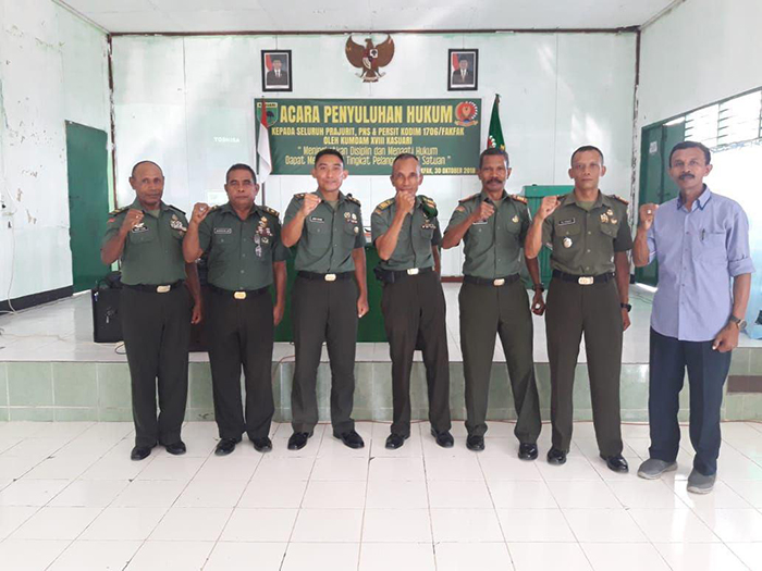 Fakfak – bertempat di Aula Kodim 1706/Fakfak telah diadakan Acara Penyuluhan Hukum kepada seluruh Prajurit PNS dan Persit Kodim 1706/Fakfak Oleh KUMDAM XIII/ KASUARI dengan Tema “Meningkatkan Disiplin dan Mentaati Hukum Dapat Mengurangi Tingkat Pelanggaran di Satuan”. Yang diikuti oleh Anggota Makodim dan Bapras, PNS, dan Ibu-Ibu Persit -+ 70 orang, Hadir dalam kegiatan Penyuluhan Hukum, Dandim 1706/Fakfak di wskili oleh Pasi Ter Kodim 1706/Fakfak( Kapten Inf Siswanto), Mayor CHK Jhoni Sosang ( Ketua Tim KUMDAM XVIII/KSR), Lettu CHK Frengky ( KUDAM XVII/KSR), Mayor Inf Mursalim (Kaminvet), Kapten CBA Ghuptayadi (Dantepbek), Kapten CPM Ary Siam Yotefa,S.H (Dansubdenpom Fakfak), Kapten Inf S Patiran (Pasipers), Kapten Inf Kahar Kadir (Danramil 01/Kota), Kapten Inf Ali Anwar (Danramil 02/Kokas), Lettu Inf Zainudin (Dan Unit Intel), Sertu Bagus Triawan ( anggota KUMDAM XVIII/KSR), Rabu (31/10/2018).