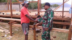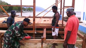 Kaimana – Babinsa Koramil 1713-03/Teluk Arguni, Sertu M. Asdikin membantu masyarakat membangun rumah Bertempat di kampung Kufirai, Distrik Teluk Arguni, guna membantu masyarakat binaannya mengatasi berbagai masalah, Kamis (02/08/2018).