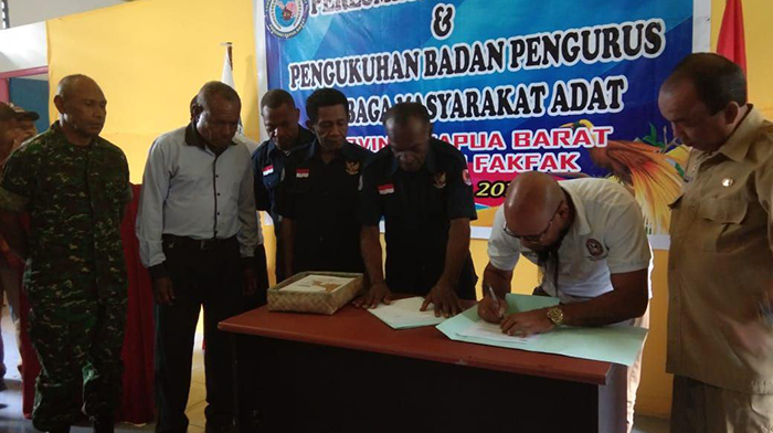 Fakfak – Bertempat di Sekretariat Lembaga Masyarakat Adat ( LMA ) Kab. Fakfak Jl. Yos Sudarso Kampung Tanama Distrik Pariwari telah dilaksanakan Acara Peresmian sekretariat dan Pengukuhan Badan Pengurus Lembaga Masyarakat Adat Provinsi Papua Barat Kab. Fakfak. Turut hadir yaitu, Drs. Suriyanto Mochramsyah, M. Si ( Asisten III ), Dandim 1706/Fakfak diwakili oleh Pa Sandi ( Letda Inf. Adam Fuad ), Ketua harian LMA Provinsi Papua Barat, Ketua Dewan Adat Mbaham Mata Kab. Fakfak serta pengurus dan tamu undangan sekitar -+40 orang.