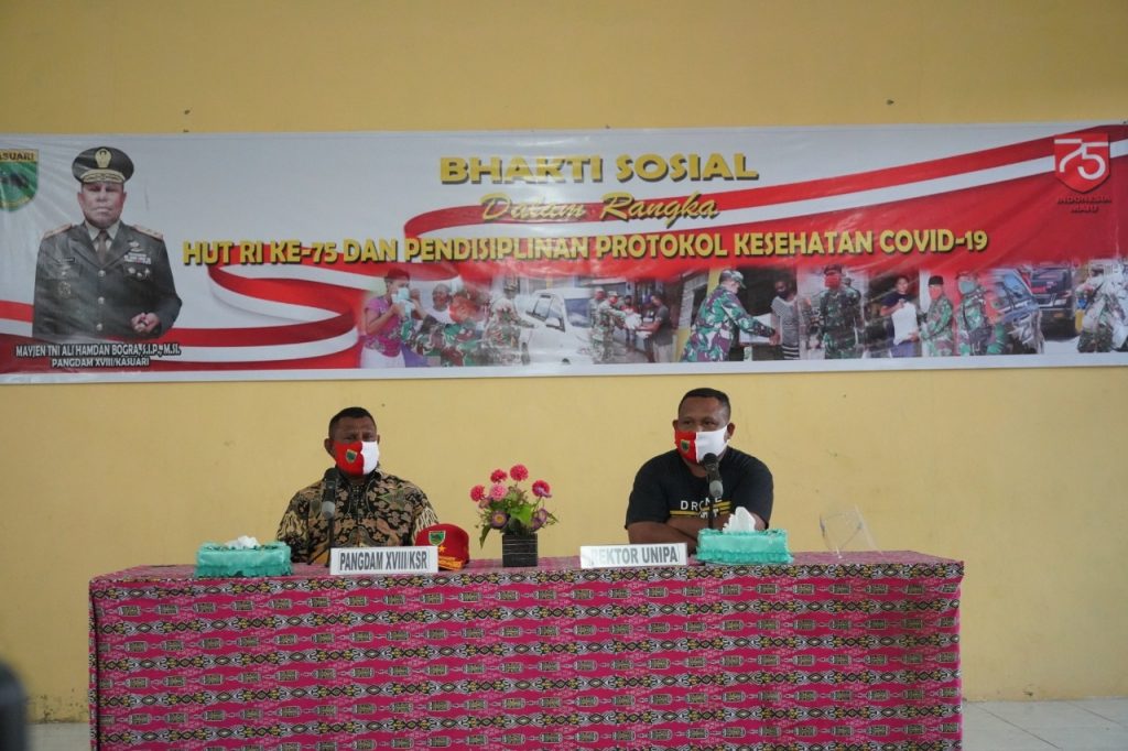 Baksos dipimpin langsung angdam XVIII/Kasuari Mayjen TNI Ali Hamdan Bogra, S.I.P. M.Si. didampingi Irdam, Kapoksahli, dan para pejabat Kodam XVIII/Kasuari lainnya. Dalam sambutannya Pangdam mengatakan bahwa kunjungannya beserta para pejabat Kodam di dalam suasana menjelang peringatan HUT Ke-75 Kemerdekaan RI tersebut  adalah bertujuan untuk silaturahmi guna mempererat hubungan persahabatan dan persaudaraan antara Prajurit Kodam XVIII/Kasuari dan para mahasiswa-mahasiswi UNIPA serta warga masyarakat setempat.