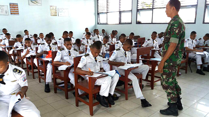 Sorong Barat – Babinsa Koramil 1704-01/Sorong Barat Serda Adil memberikan materi Wawasan Kebangsaan tentang peristiwa G 30 S/PKI kepada siswa SUPM di Aula Kampus Jl. Ahmad Yani Kelurahan Klakublik Distrik Sorong Kota, Jumat (22/09/2017).