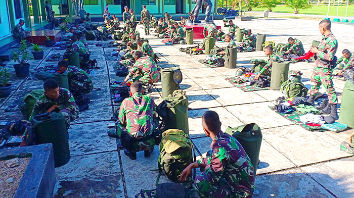 Sorong – Yonif RK 752/VYS melaksanakan gelar pasukan dan perlengkapan Prajurit yang akan mengikuti pendidikan Raider di Pusdikpassus Batujajar, Bertempat di belakang Mako prajurit, Sabtu (21/07/2018).