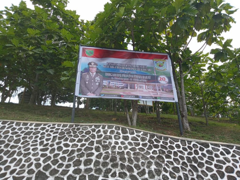 Personel Pendam XVIII/Kasuari bersama warga masyarakat sedang memasang banner Ucapan Selamat Ulang Tahun dari Pangdam XVIII/Kasuari beserta Keluarga Besar Kodam XVIII/Kasuari atas Hari Jadi Ke-20 Provinsi Papua Barat, Sabtu (12/10/2019) di Arfai I (depan Makodam), Maruni, dan Wosi, Kabupaten Manokwari, Papua Barat.
