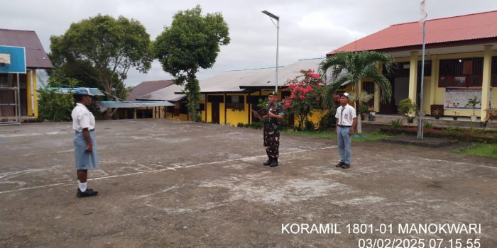 Dalam rangka kegiatan pembinaan karakter para siswa sekolah dan menumbuhkan sikap yang sesuai dengan nilai-nilai Pancasila, Danramil 1801-01/Manokwari Mayor Inf D. Mendrofa melaksanakan kegiatan Wawasan Kebangsaan dengan bertindak sebagai Inspektur Upacara di SMA Katolik Santo Paulus Swapen Manokwari, Provinsi Papua Barat, Senin, (03/02/2025).