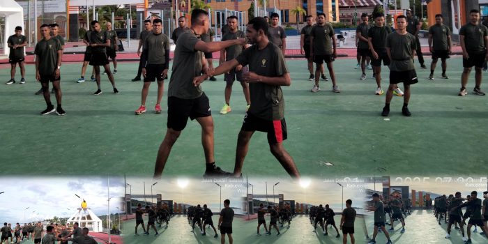 Fakfak- Tampak Puluhan Prajurit Korem 182/Jazira Onim Melaksanakan Latihan Bela Diri Taktis (BDT) di Sport Center Nortem Mareh, Kabupaten Fakfak, pada Jumat Pagi (31/01/2025).