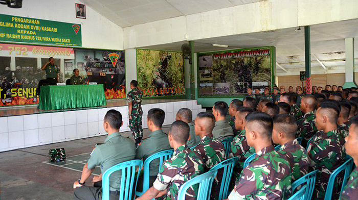 Sorong – Prajurit Yonif 752/VYS dan Denzipur 13/PPA melaksanakan Jam Komandan (Jam Dan) yang di ambil oleh Pangdam XVIII/Kasuari, Mayjen TNI Joppye Onesimus Wayangkau dihadiri oleh Danrem 171/PVT Brigjen TNI Ignatius Yogo Triyono,M.A, Kasrem 171/PVT Kolonel Inf Dian Sundiana, S.E., Para Kasi Korem 171/PVT, Para Komandan Satuan dan Ka Balak Aju jajaran Korem 171/PVT, bertempat di Aula Yonif RK 752/VYS Jl. Basuki Rahmad, Km 12, Sorong-Papua Barat, Jumat (02/06/17).