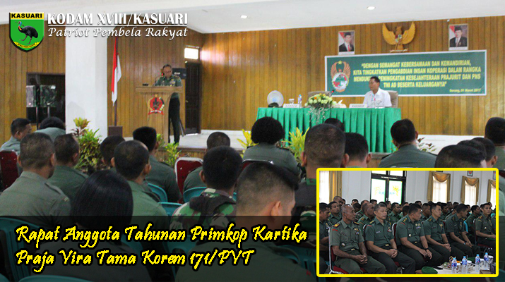 Sorong – Danrem 171/PVT Brigjen TNI Ignatius Yogo, MA membuka Rapat Anggota Tahunan (RAT) Primkop Kartika Praja Vira Tama Korem 171/PVT tutup buku tahun 2016 sebagai laporan pertanggungjawaban Pengurus Primer Koperasi Kartika Praja Vira Tama Korem 171/PVT, diikuti oleh seluruh Prajurit dan PNS Korem 171/PVT serta jajaran sebagai anggota Koperasi Kartika Praja Vira Tama Korem 171/PVT, dihadiri oleh para Kasi Korem 171/PVT, Kepala Dinas Koperasi dan UMKM Kota Sorong yang diwakili oleh Bpk Chris, serta para Komandan Satuan dan Ka Balak Aju jajaran Korem 171/PVT bertempat di Gedung Praja Vira Tama Jl. Pramuka No. 1 Sorong-Papua Barat, Rabu (01/03/17).