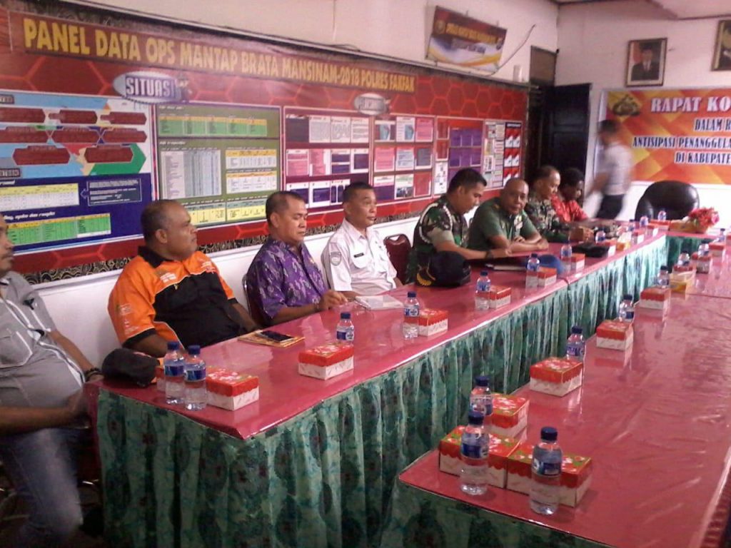 Rapat tersebut dibuka oleh Wakapolres Fakfak dan dihadiri oleh perwakilan seluruh Intansi di Kabupaten Fakfak dengan maksud agar terciptanya soliditas dan kerjasama antar instansi dalam rangka Penanggulangan Bencana Alam.