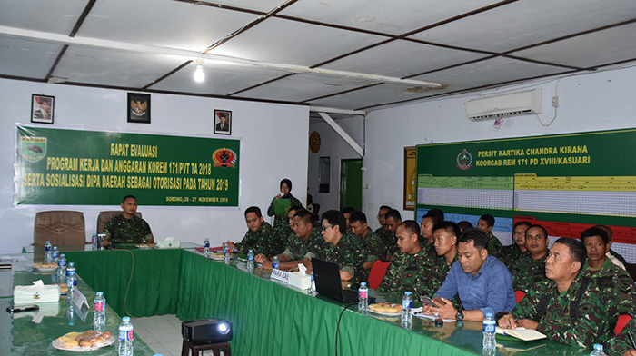 Sorong – Rapat Evaluasi Program Kerja dan Anggaran Korem 171/PVT TA 2018 serta Sosialisasi DIPA sebagai Otorisasi pada TA 2019 dipimpin oleh Kasi Ren Korem 171/PVT Kolonel Arh Eka Wahyudi, S.I.P., di hadiri oleh Para Perwira Korem 171/PVT, para Bintara pembuat Wabku jajaran Korem 171/PVT, bertempat di Ruang Persit KCK Korem 171/PVT, Sorong-Papua Barat, Senin (26/11/2018).