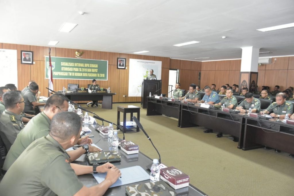 Manokwari – Ruang Yudha Makodam XVIII/Ksr berlangsung kegiatan RAPAT SOSIALISASI INTERNAL DIPA Sebagai Otorisasi Ta. 2019 Dan Panproggar Kodam XVIII/Kasuari TW III Tahun Anggaran. Kegiatan ini dipimpin langsung oleh Pangdam XVIII/Ksr Mayjen TNI Joppye Onesimus Wayangkau yang dihadiri oleh Kasdam XVIII/Ksr, Danrem 171/PVT, para Staf Ahli Pangdam XVIII/Ksr, Irdam XVIII/Ksr, para Asisten Kasdam XVIII/Ksr, para Kabalakdam XVIII/Ksr, serta para Dansat jajaran Kodam XVIII/Ksr, Selasa (16/10/2018).