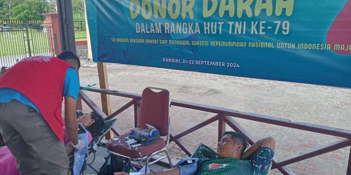 Momi Waren – Dalam rangka memperingati Hari Ulang Tahun ke-79 Tentar Nasional Indonesia, Rindam XVIII/Kasuari bersama Kodim 1808/Manokwari Selatan dan Ibu – Ibu Persit KCK menggelar kegiatan Donor Darah, bertempat di Lapangan Pendopo Ransiki, Jl. trans Manokwari – Bintuni, Kampung Ransiki, Distrik Ransiki Kota, Kabupaten Manokwari Selatan, Papua Barat, Sabtu (21/09/2024).