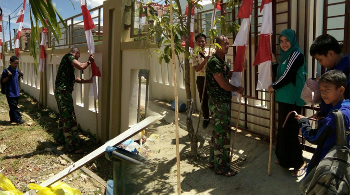 Sambut HUT RI, Babinsa Pasang Umbul-umbul Di Sekolah MTS Muhammadiyah Sorong