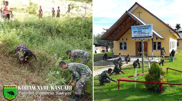 Satgas Pamrahwan Yonif RK 752/VYS yang dipimpin langsung oleh Danki Satgas pamrahwan Kapten Inf Subuki melaksanakan kegiatan Karya Bhakti bersama masyarakat di Wilayah Sorong, Jumat (04/04/17).