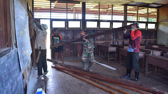 Sorong – Dengan semangat gotong royong yang tinggi Satgas TMMD Ke – 101 Kodim 1704/Sorong dan masyarakat sailala yang menjadi sasaran fisik TMMD bekerja bersama-sama menyelesaikan pekerjaan sasaran fisik rehab ruangan SD Inspres 8 bertempat di Kampung Sailala Distrik Sayosa Timur Kabupaten Sorong, Rabu (25/04/2018).