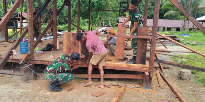 Satgas TNI Manunggal Membangun Desa (TMMD) Ke-123 Kodim 1806/Teluk Bintuni bersama masyarakat Kampung Riendo dan Kampung Maryedi bergotong-royong dalam pembangunan rumah layak huni untuk Bapak Yulianus, salah satu warga yang membutuhkan tempat tinggal yang lebih baik di Distrik Farfurwar, Kabupaten Teluk Bintuni, Provinsi Papua Barat. Rabu, 26 Februari 2025.