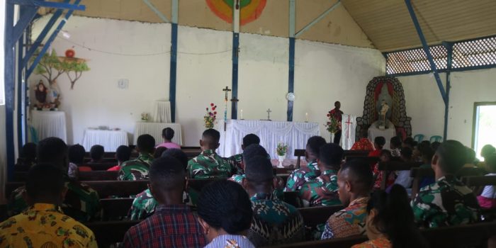 Dalam rangka mempererat hubungan dengan masyarakat, anggota Satgas TMMD Ke-123 Kodim 1806/Teluk Bintuni melaksanakan ibadah bersama warga Distrik Farfurwar di Gereja Santo Paulus, Kampung Fruata, Kabupaten Teluk Bintuni, Papua Barat, pada Minggu (9/03/2025).