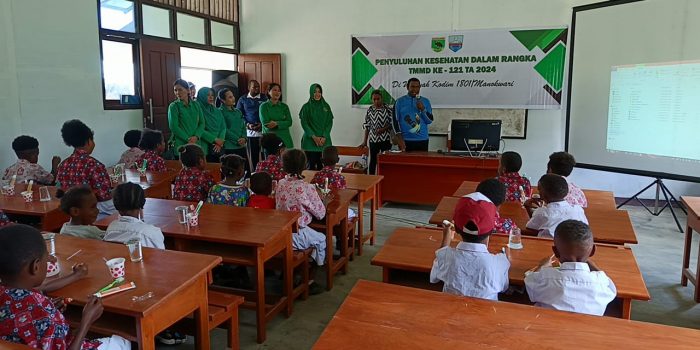 Penyuluhan Kesehatan ini dipimpin langsung oleh Ketua Persit KCK Cabang XII Kodim 1801/Manokwari Ny.Ira Agus Donny yang didampingi Kepala Puskesmas Bapak Maikel Kafiar dan Dan SSK Satgas TMMD. Adapun materi yang diberikan kepada siswa-siswi tersebut diantaranya Sosialisasi tentang Kesehatan, cara cuci tangan yang benar, cara menggosok gigi yang benar, bersihkan dan potong kuku serta memberikan makanan pendamping bergizi.