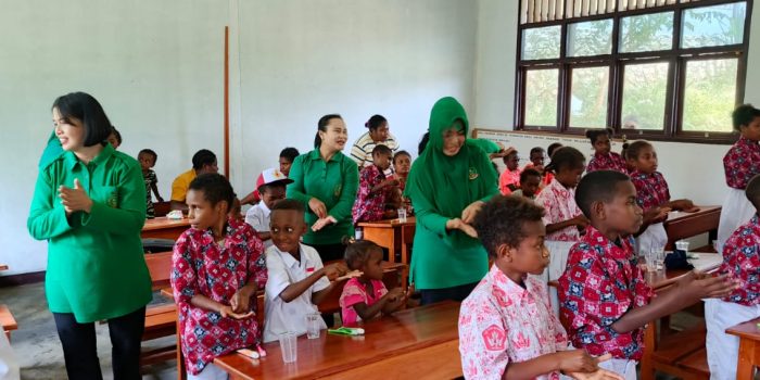 Guna menanamkan pola hidup sehat dan bersih bagi anak-anak sejak usia dini, Satgas TMMD Kodim 1801/Manokwari dan Persit KCK Cabang XII Manokwari menggandeng Puskesmas Distrik Mokwam mengajar dan memberikan pemahaman sekaligus memberikan contoh cara menjaga kebersihan diri mulai dini bagi siswa-siswi di Sekolah SD Negeri 79 Kwau Distrik Mokwam, Kabupaten Manokwari, Provinsi Papua Barat, Jumat (09/08/2024).