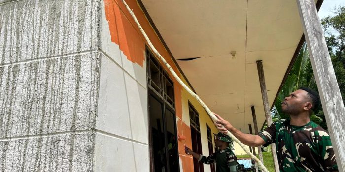 Maybrat – Untuk kenyamanan beribadah warga di Kampung Afkrem, personel Satgas Pamtas RI-PNG Kewilayahan Papua Barat Daya Yonif 762/VYS Pos Afkrem melaksanakan gotong royong pengecatan Gereja Kanaan Afkrem bersama warga Kampung Afkrem, Distrik Aitinyo, Kabupaten Maybrat.Selasa (28/01/2025).