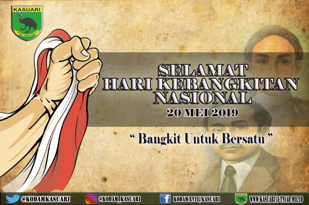 Selamat Hari Kebangkitan Nasional “Bangkit Untuk Bersatu” admin 20/05/2019 BERITA KEGIATAN Posted in BERITA KEGIATAN, PENGUMUMAN Navigasi pos Previous Previous post: Pangdam Beserta Keluarga Besar Kodam XVIII/Kasuari Mengucapkan Selamat Hari Raya Waisak 2563/2019Next Next post: Dirgahayu Kodam III/Siliwangi “Esa Hilang, Dua Terbilang”