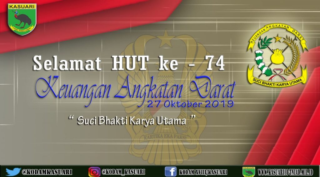 Selamat HUT ke – 74 Keuangan Angkatan Darat “Suci Bhakti Karya Utama” admin 28/10/2019 BERITA KEGIATAN 0 Komentar Posted in BERITA KEGIATAN, PENGUMUMAN Navigasi pos Previous Previous post: Berkunjung Ke Papua Barat, Presiden Joko Widodo Dikenalkan dengan “Negeri Di Atas Awan”Next Next post: Kasdam XVIII/Kasuari Tutup TMMD 106 Kodim 1803/Fakfak Tinggalkan Balasan Batalkan balasanAlamat email Anda tidak akan dipublikasikan. Ruas yang wajib ditandai *Komentar * Nama * Email * Situs Web Simpan nama, email, dan situs web saya pada peramban ini untuk komentar saya berikutnya. If you are a human, do not fill in this field.